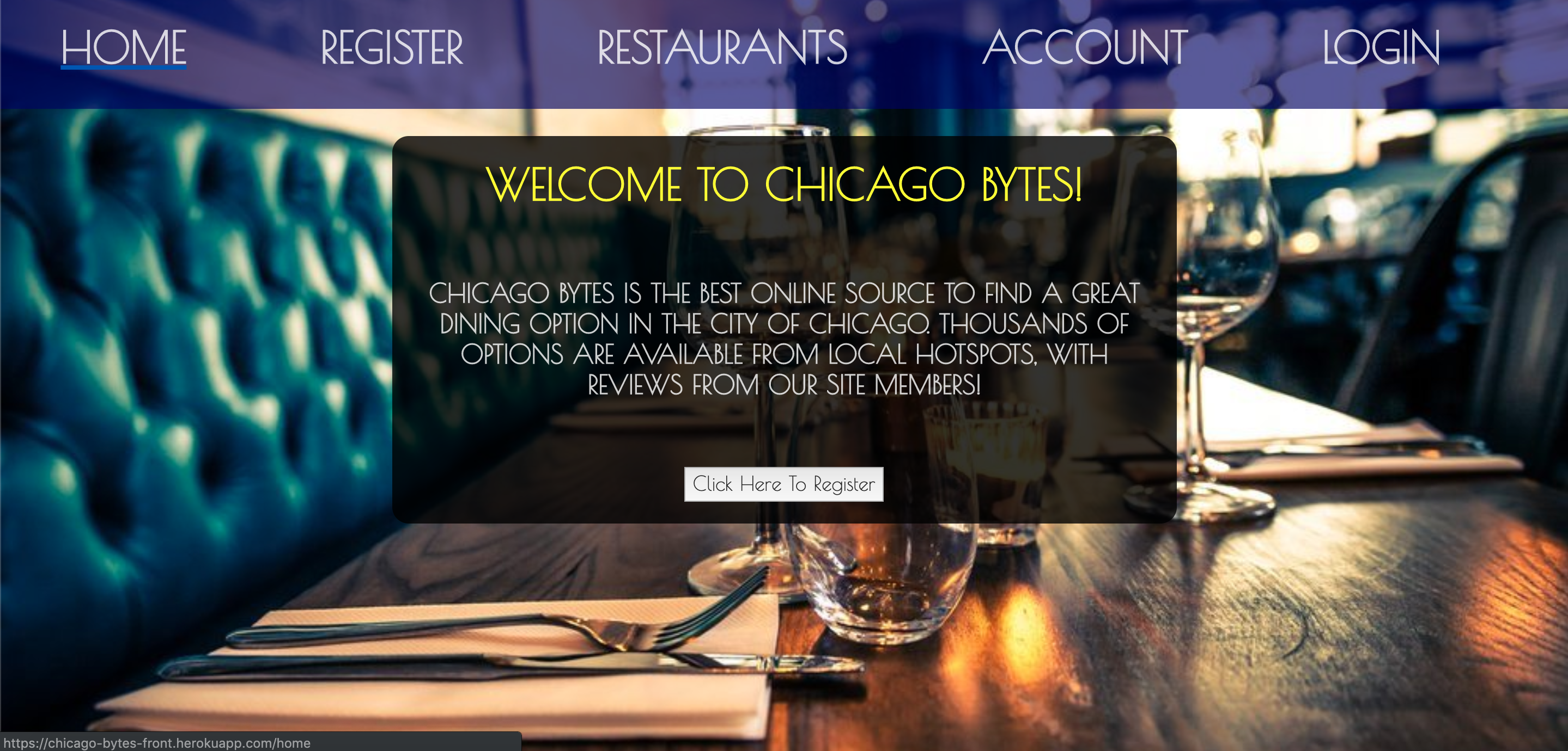 Chicago-Bytes was created for Project III at General Assembly for the Software Engineering Immersive. This project was Bill's first exploration with React and also a fully decoupled full-stack application. Chicago Bytes leverages the Zomato API to provide a search feature for users to locate nearby restaurants in the downtown Chicago area.