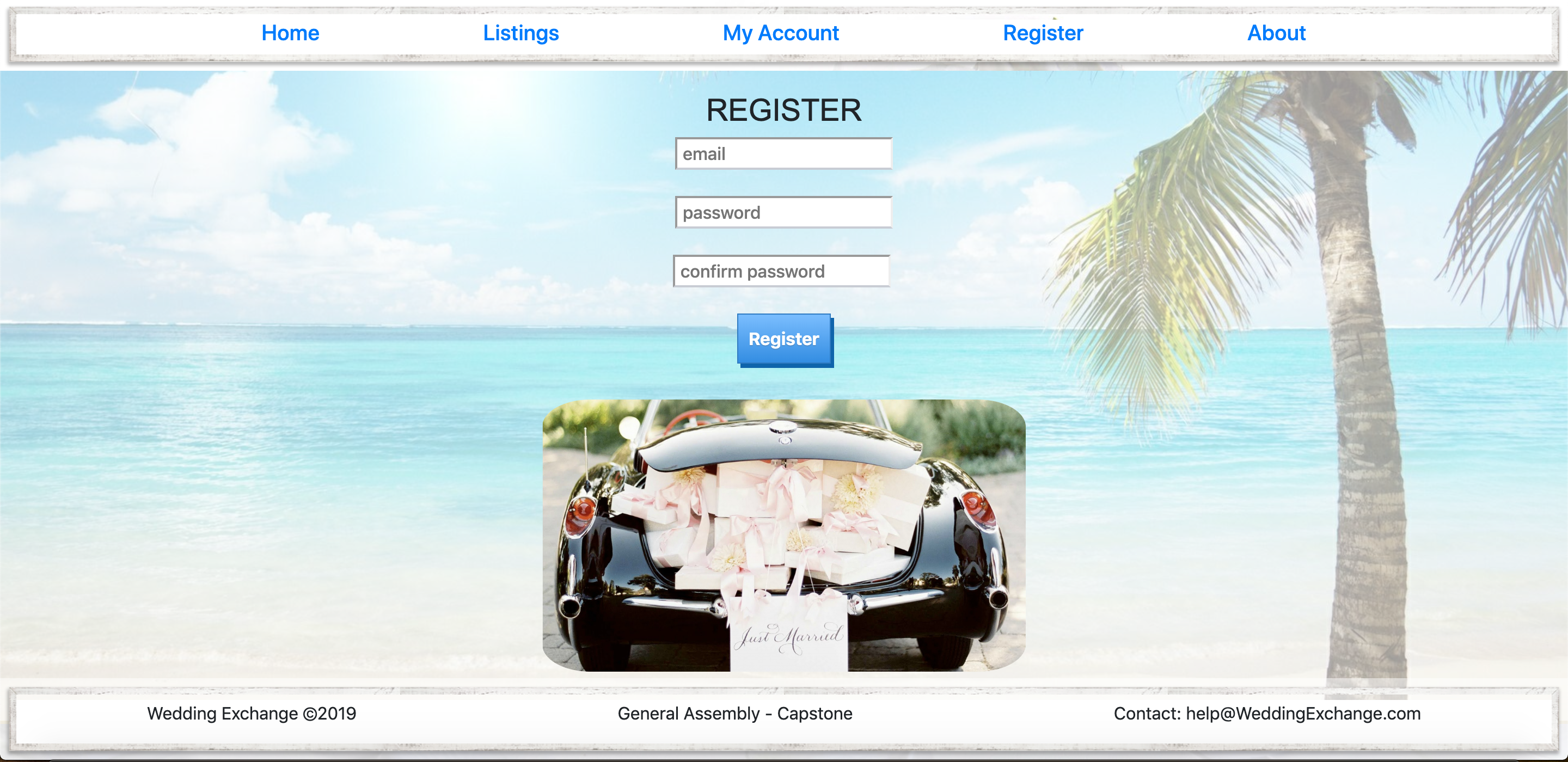 While working through the planning process of his upcoming wedding, Bill discovered a need for an online platform to connect individuals for the purpose of buying, selling, and trading pre-owned wedding goods. Bill built Wedding-Exchange for the capstone project of SEI at General Assembly. After creating an account, users can create and post listings which will be viewable by all other Wedding-Exchange members.
